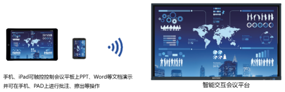 會議商討的過程中,坐在遠處座位的與會人員在發表自己意見的過程中,需要在演示的文稿上進行增加批注,方便交流溝通時,可通過鏡像控制功能,在手機上即可直接進行批注操作,無需尋找白板及書寫筆,即可進行高效的溝通,因視力或距離原因而看不清大屏的與會人員,亦不用因此而困擾,通過手機、PAD等移動終端連至智能交互會議平臺上,可在自己的手機上同步觀看相同內容,支持不少于6路移動終端同時觀看,無線傳輸最遠距離可達15米。