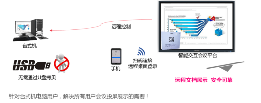 對有較高的信息安全需求時,會議的過程中需要用到企業內部員工內部相關數據時,針對無筆記本員工,智能交互會議平臺可通過管理軟件可一鍵搜索到內部對應人員臺式電腦,進行遠程文檔展示,無需進行U盤拷貝,確保文件安全性更有保障!