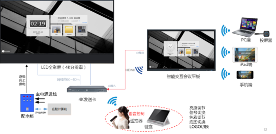 大型會議室、培訓室使用的過程中,為照顧坐在后面的與會人員可以看清屏幕的顯示內容,會議室一般可按照面積配置大的LED全彩屏顯示屏(或LCD拼接屏\激光融合投影),提供智能交互會議平板與拼接顯示大屏、筆記本電腦、手機、PAD多屏互動顯示相同內容,智能交互會議平板書寫、批注內容均可實現多屏實時同步顯示,讓顯示更具特色、互聯視界,動享天下!