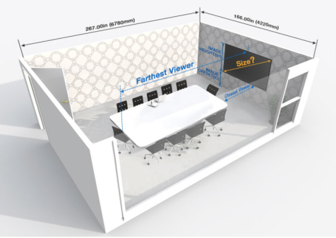 確定屏幕合適的尺寸和位置也是設計過程中的關鍵部分,不同的場景在使用和觀看方面均有特定的需求,如何選擇屏幕的最佳圖像尺寸、最遠和最近觀看者的位置?針對會議室我們將提供一套計算公式科學的定制滿足應用需求。