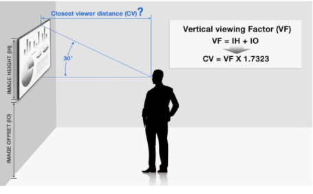 最近觀看距離(CV):顯示圖像與觀看者之間的水平距離,CV=(IH+IO)×1.732;(IH圖像高度,IO圖像偏移),IO圖像偏移是指地板到圖像的高度與觀看高度之間的差值,與會者坐著的觀看高度為1.2m左右,站著的觀看高度在1.5m左右,圖像的底部高于觀看高度,則為正數,圖像底部低于觀看高度則為負數。