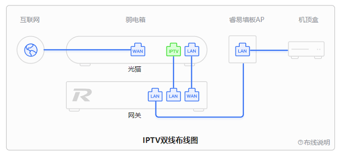 ●雙線路部署場景:通過專用口光貓部署的場景稱為雙線路部署場景。專用口光貓上有兩個獨立的網(wǎng)口,連接兩根網(wǎng)線分別提供IPTV服務和上網(wǎng)服務,實際使用中的接線圖如下圖所示: