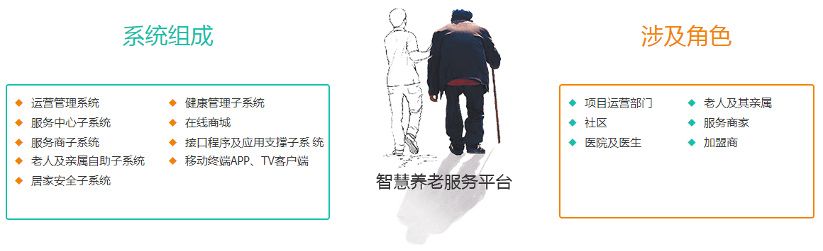 利用先進的IT技術手段,開發面向居家老人、社區、機構的物聯網系統平臺,提供實時、快捷、高效、物聯化、智能化的養老服務。借助“養老”和“健康”綜合服務平臺,將醫療服務、運營商、服務商、個人、家庭連接起來,滿足老年人多樣化、多層次的需求。