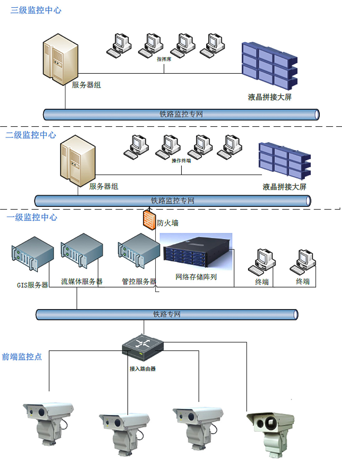 鐵路視頻監(jiān)控系統(tǒng)主要由三大部分組成:前端圖像采集系統(tǒng)、視頻傳輸系統(tǒng)、后端監(jiān)控管理指揮系統(tǒng)。該系統(tǒng)滿足本地監(jiān)控和中心聯(lián)網(wǎng)多級(jí)網(wǎng)絡(luò)化視頻監(jiān)控的需求???4小時(shí)實(shí)時(shí)監(jiān)控鐵路沿線安全情況,降低了安全監(jiān)控人員的勞動(dòng)強(qiáng)度,為監(jiān)控中心指揮提供強(qiáng)有力的保障,使各級(jí)監(jiān)視中心的調(diào)度人員通過監(jiān)視遠(yuǎn)端傳送上來的現(xiàn)場(chǎng)圖像,直觀、準(zhǔn)確、及時(shí)地了解各工區(qū)的實(shí)際情況。前端圖像采集系統(tǒng)的數(shù)據(jù)傳輸至各采集站,作業(yè)區(qū),廠區(qū)監(jiān)控中心后,視頻解碼器設(shè)備還原出視頻信號(hào)至數(shù)據(jù)接收器,即可完成數(shù)據(jù)的采集,傳輸,匯總。