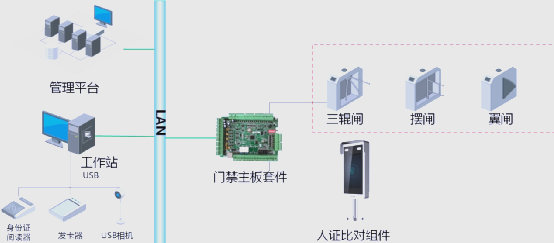 人員通道子系統主要包括人員通道閘機、工作站以及發卡器等核心組件。在安保需求極高的環境中,該系統還可進一步配備人臉識別功能,以增強安全性。其系統架構示意圖如下: