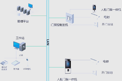 前端設備,包括人臉門禁一體機、電控鎖以及出門按鈕等,其核心職責是采集并判斷人員的身份信息與通道的進出權限。當認證通過后,人臉一體機會發出電鎖開門信號,電鎖接收該信號并執行開門動作,從而控制人員的放行。此外,傳輸網絡負責系統內部的數據傳輸,確保門禁一體機與管理中心之間能夠高效地進行數據通訊。而管理中心,作為系統的核心,主要負責系統配置、信息管理以及實時顯示系統狀態等重要功能,通常由綜合安防管理平臺和中心發卡授權設備共同構成。