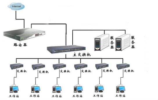 中型局域網可以采用兩層結構,即中心交換機層和供各個節點連入的桌面交換機層。中心交換機可以采用一臺高檔的企業級交換機,提供多個千兆網絡端口。各個節點的桌面交換機連接到中心交換機上,這些桌面交換機內部就相當于一個小型局域網。